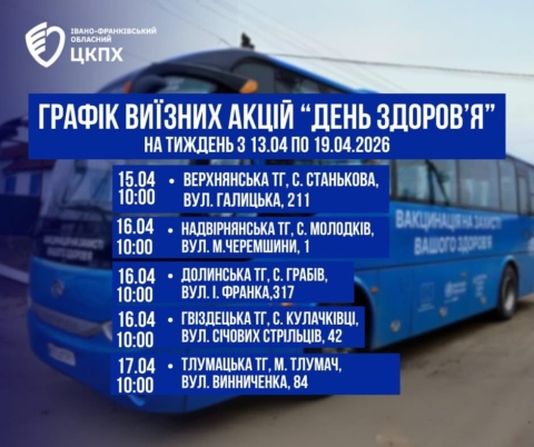 Графік виїзних акцій «День здоров’я» на тиждень з 13.04. по 19.04.2026 року