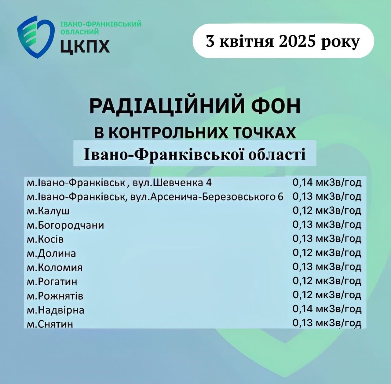 Станом на ранок 03.04.2025 показник радіаційного фону становить від 0,12 мкЗв/год до 0,14 мкЗв/год (що не перевищує природний радіаційний фон для Прикарпаття в межах 0,32 мкЗв/год)