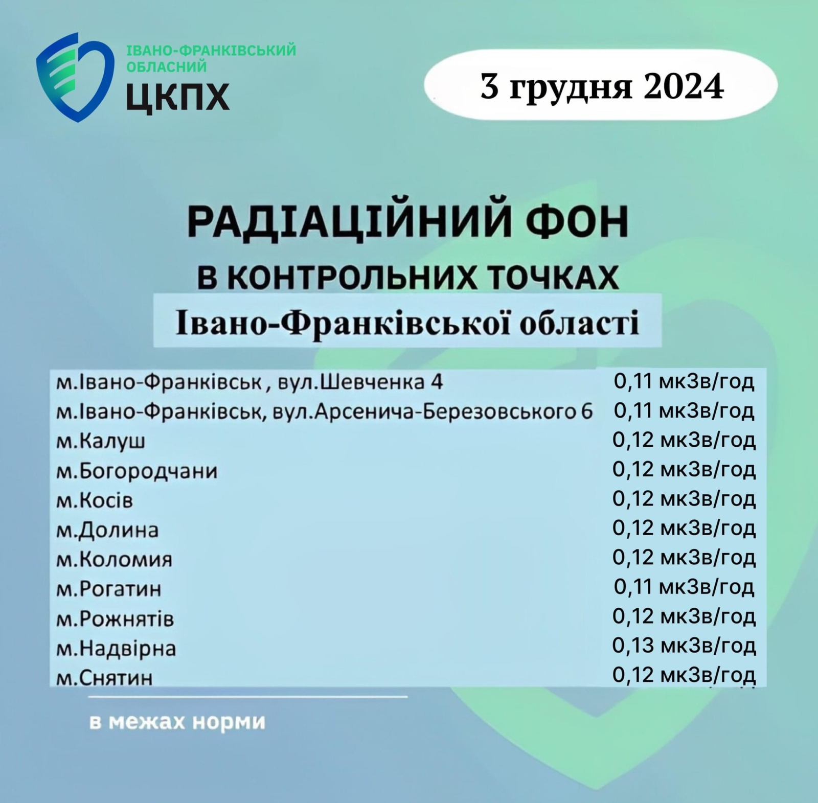 Станом на ранок 03.12.2024 показник радіаційного фону становить від 0,11 мкЗв/год до 0,12 мкЗв/год (що не перевищує природний радіаційний фон для Прикарпаття в межах 0,32 мкЗв/год)