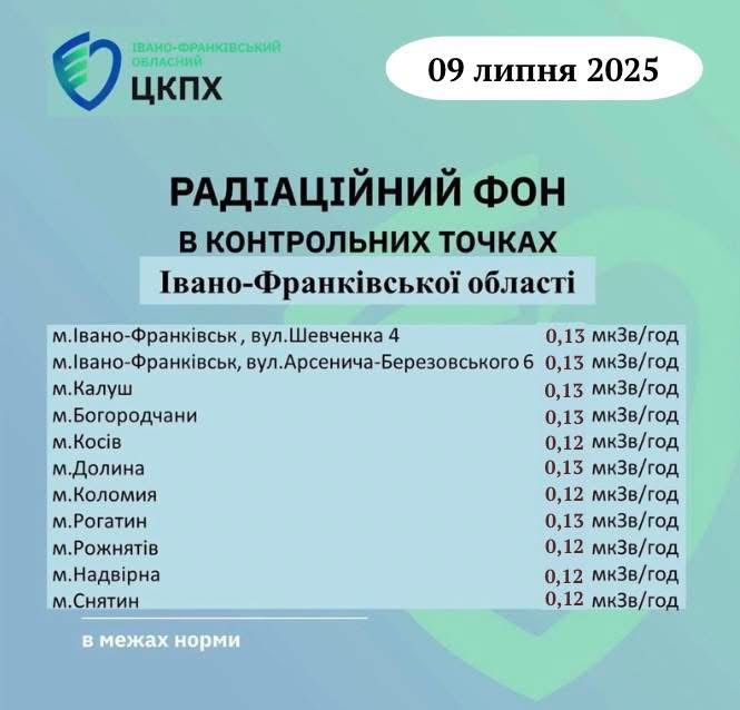 Станом на ранок 09.07.2025 показник радіаційного фону становить від 0,12 мкЗв/год до 0,13 мкЗв/год (що не перевищує природний радіаційний фон для Прикарпаття в межах 0,32 мкЗв/год)