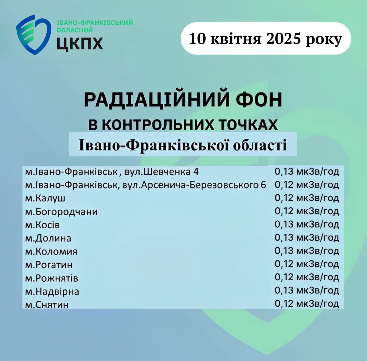 Станом на ранок 10.04.2025 показник радіаційного фону становить від 0,12 мкЗв/год до 0,13 мкЗв/год (що не перевищує природний радіаційний фон для Прикарпаття в межах 0,32 мкЗв/год)