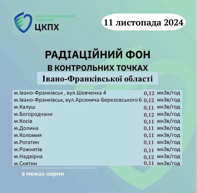 Станом на ранок 11.11.2024 показник радіаційного фону становить від 0,11 мкЗв/год до 0,12 мкЗв/год (що не перевищує природний радіаційний фон для Прикарпаття в межах 0,32 мкЗв/год)