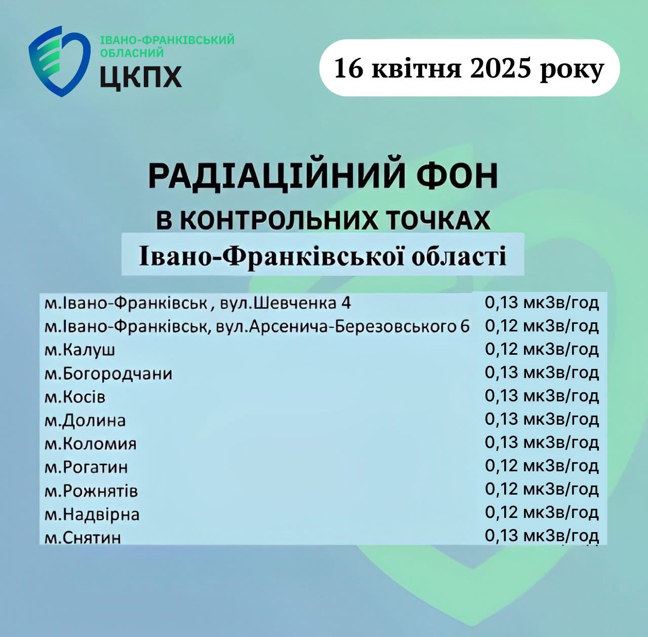 Станом на ранок 16.04.2025 показник радіаційного фону становить від 0,12 мкЗв/год до 0,13 мкЗв/год (що не перевищує природний радіаційний фон для Прикарпаття в межах 0,32 мкЗв/год)