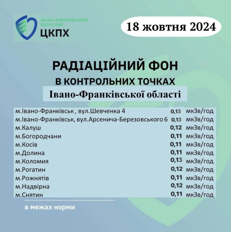 Станом на ранок 18.10.2024 показник радіаційного фону становить від 0,11 мкЗв/год до 0,12 мкЗв/год (що не перевищує природний радіаційний фон для Прикарпаття в межах 0,32 мкЗв/год)