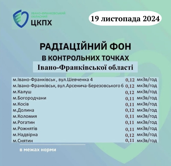 Станом на ранок 15.11.2024 показник радіаційного фону становить від 0,11 мкЗв/год до 0,12 мкЗв/год (що не перевищує природний радіаційний фон для Прикарпаття в межах 0,32 мкЗв/год)