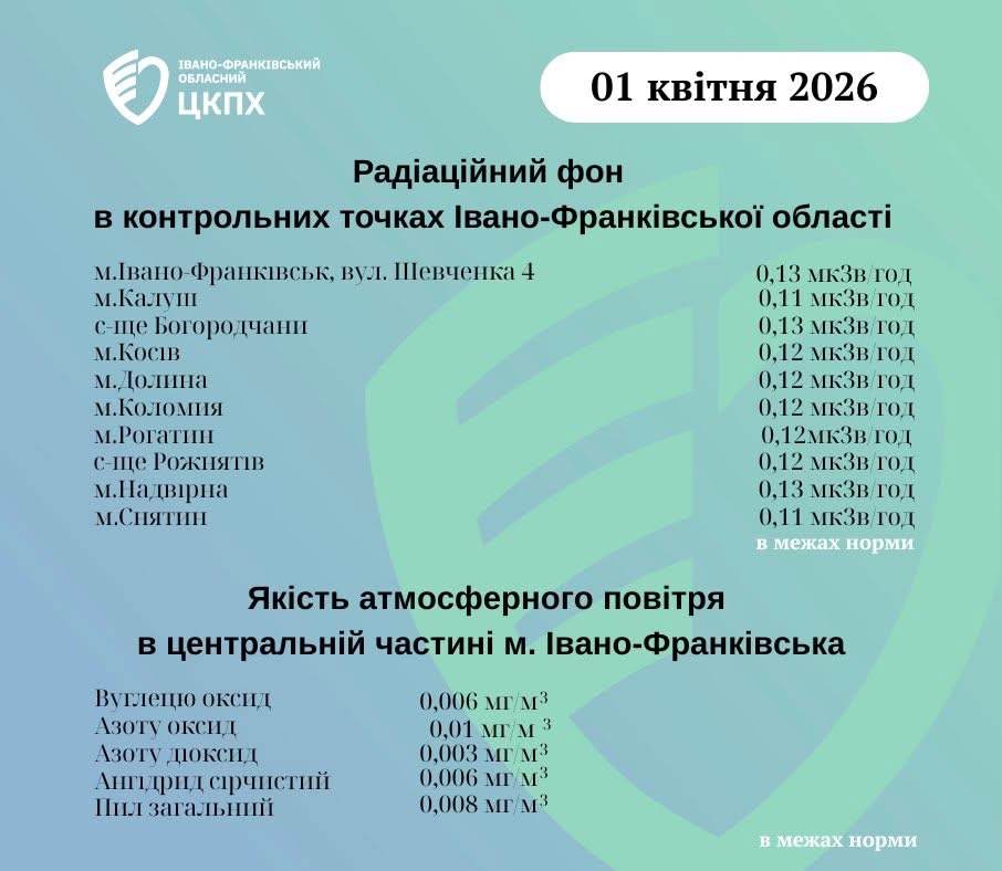 Станом на ранок 01.04.2026 показник радіаційного фону становить від 0,11 мкЗв/год до 0,13 мкЗв/год (що не перевищує природний радіаційний фон для Прикарпаття в межах 0,32 мкЗв/год).