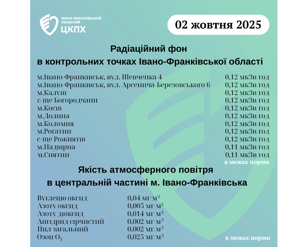 Результати гамма-фону в населених пунктах області та якості повітря в м. Івано-Франківську 02.10.2025