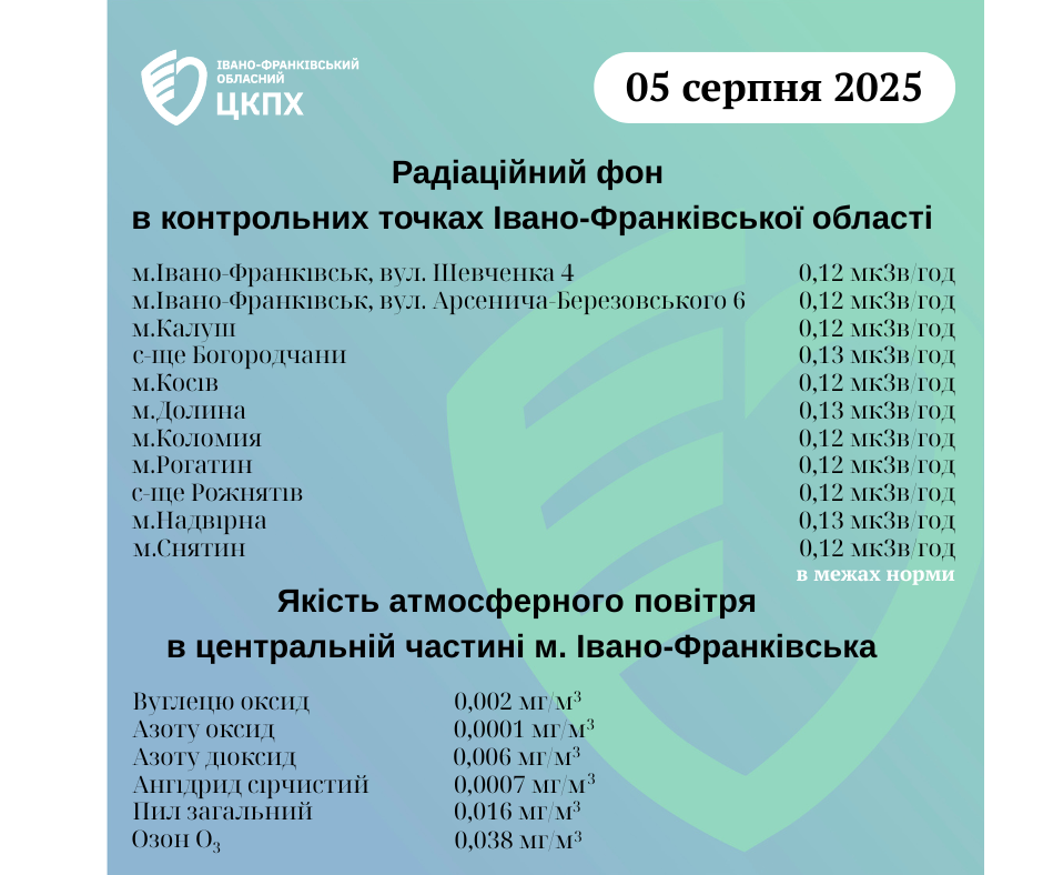 Станом на ранок 05.08.2025 показник радіаційного фону становить від 0,12 мкЗв/год до 0,13 мкЗв/год (що не перевищує природний радіаційний фон для Прикарпаття в межах 0,32 мкЗв/год).