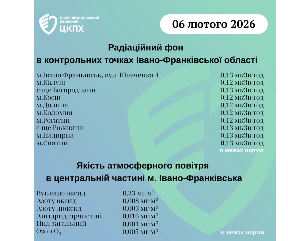 Станом на ранок 06.02.2026 показник радіаційного фону становить від 0,12 мкЗв/год до 0,13 мкЗв/год (що не перевищує природний радіаційний фон для Прикарпаття в межах 0,32 мкЗв/год).