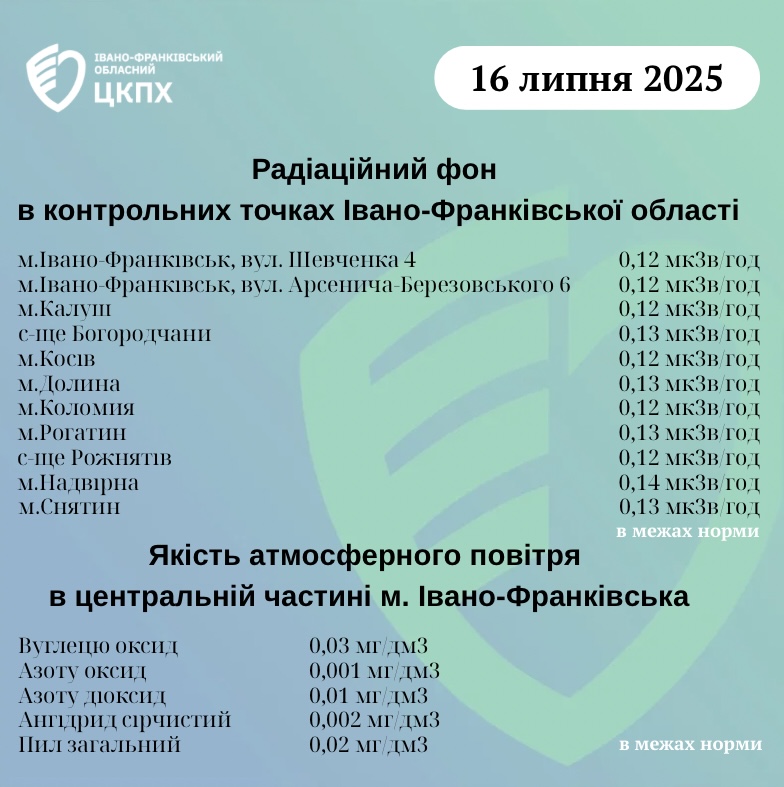 Станом на ранок 16.07.2025 показник радіаційного фону становить від 0,12 мкЗв/год до 0,14 мкЗв/год (що не перевищує природний радіаційний фон для Прикарпаття в межах 0,32 мкЗв/год).