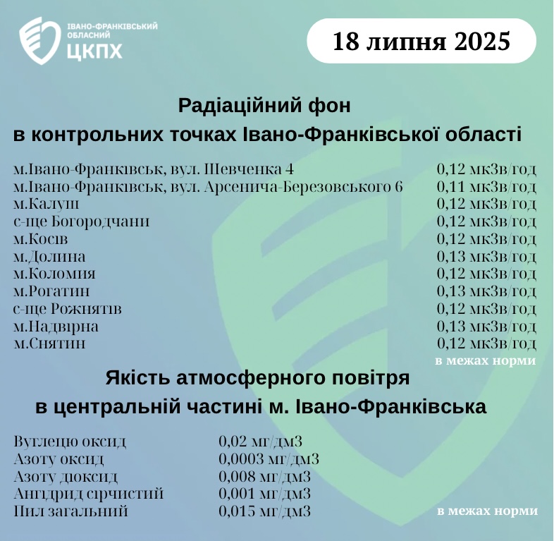 Станом на ранок 18.07.2025 показник радіаційного фону становить від 0,11 мкЗв/год до 0,13 мкЗв/год (що не перевищує природний радіаційний фон для Прикарпаття в межах 0,32 мкЗв/год).
