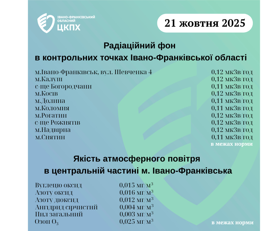 Станом на ранок 21.10.2025 показник радіаційного фону становить від 0,11 мкЗв/год до 0,12 мкЗв/год (що не перевищує природний радіаційний фон для Прикарпаття в межах 0,32 мкЗв/год).