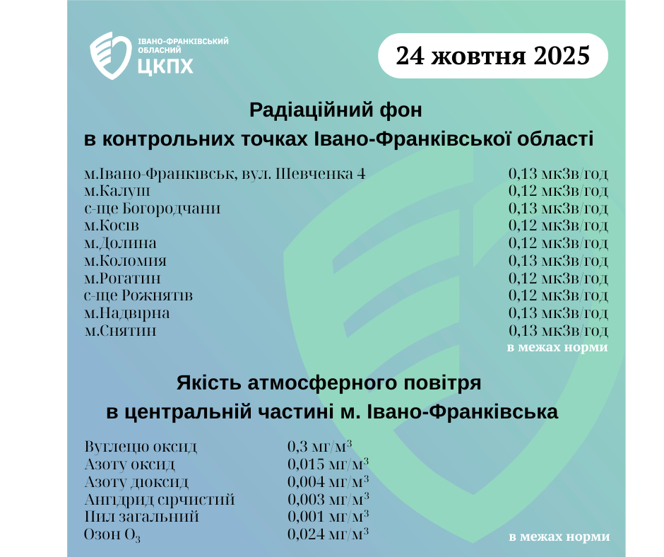 Станом на ранок 24.10.2025 показник радіаційного фону становить від 0,12 мкЗв/год до 0,13 мкЗв/год (що не перевищує природний радіаційний фон для Прикарпаття в межах 0,32 мкЗв/год).