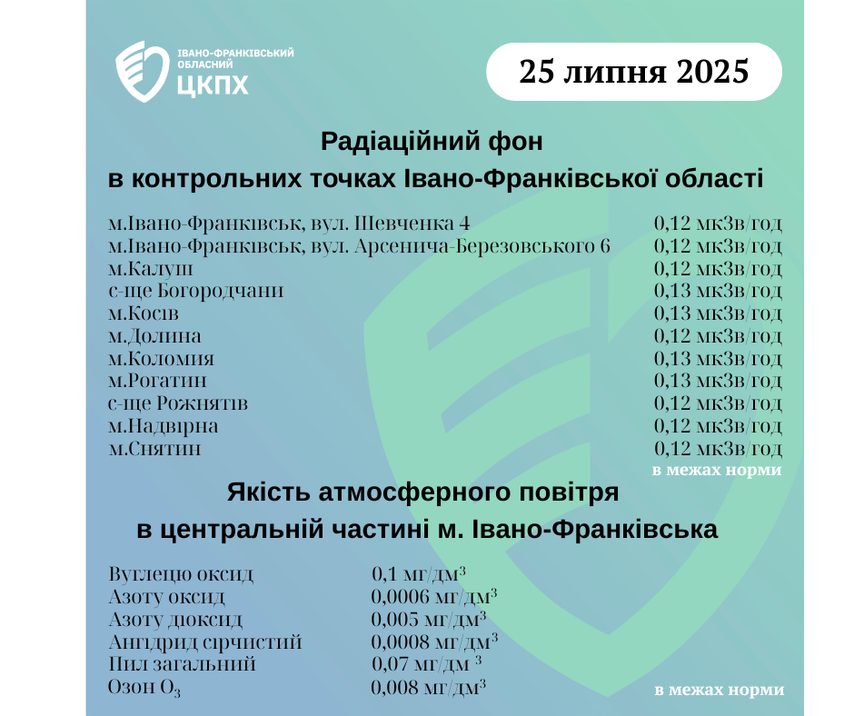 Станом на ранок 25.07.2025 показник радіаційного фону становить від 0,12 мкЗв/год до 0,13 мкЗв/год (що не перевищує природний радіаційний фон для Прикарпаття в межах 0,32 мкЗв/год).