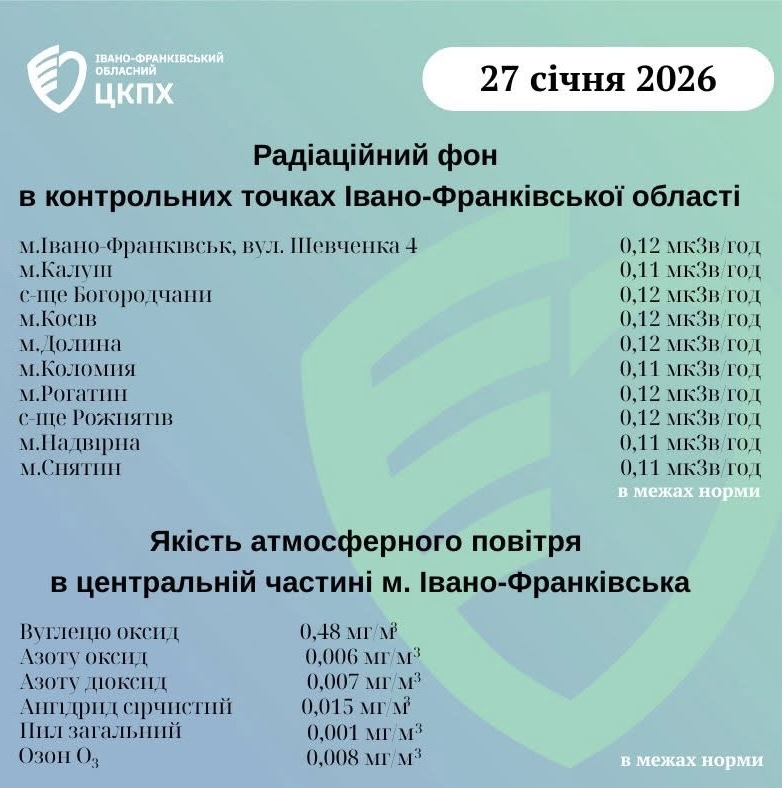 Станом на ранок 27.01.2026 показник радіаційного фону становить від 0,11 мкЗв/год до 0,12 мкЗв/год (що не перевищує природний радіаційний фон для Прикарпаття в межах 0,32 мкЗв/год).