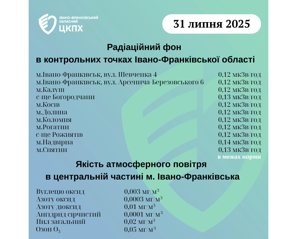 Станом на ранок 31.07.2025 показник радіаційного фону становить від 0,12 мкЗв/год до 0,14 мкЗв/год (що не перевищує природний радіаційний фон для Прикарпаття в межах 0,32 мкЗв/год).