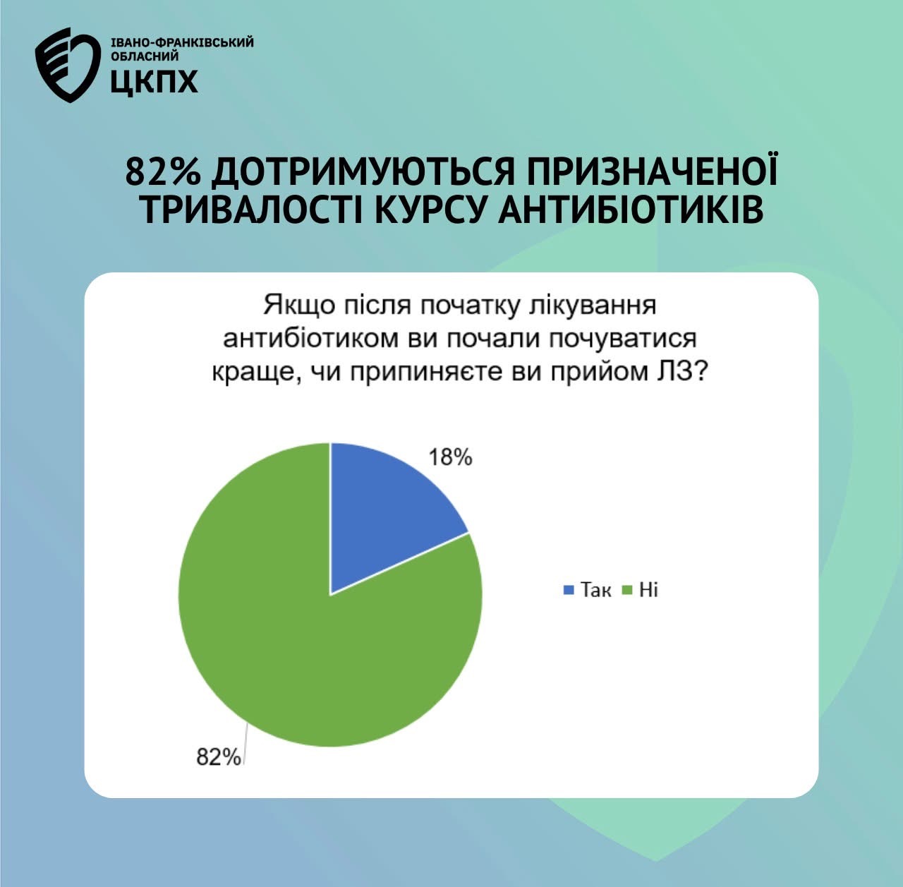 82% дотримуються призначеного курсу антибіотиків. Це добрий показник, який демонструє відповідальність людей. Проте 18% все ще припиняють лікування завчасно — і саме це є однією з найпоширеніших причин формування антибіотикорезистентності.