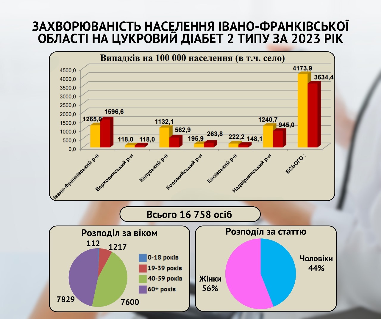 Ситуація на Прикарпатті. В 2023 році показники захворюваності населення Івано-Франківської області на діабет були на другому місці серед усіх зареєстрованих випадків захворювань на неінфекційні захворювання і становили 4174 вип. на 100 тис. Ця хвороба частіше реєструвалася у жінок (56% проти 44% у чоловіків). Більш вразливими до діабету серед вікових груп стали люди старшого 60+ (47%) та середнього 40+ (45%) віку. Викликає занепокоєння той факт, що діабет молодшає, адже ним в тому році захворіло 112 дітей та 1217 молодих людей. За територіальним розподілом, випадків діагностованого діабету було найбільше в Івано-Франківському та Надвірнянському районі .