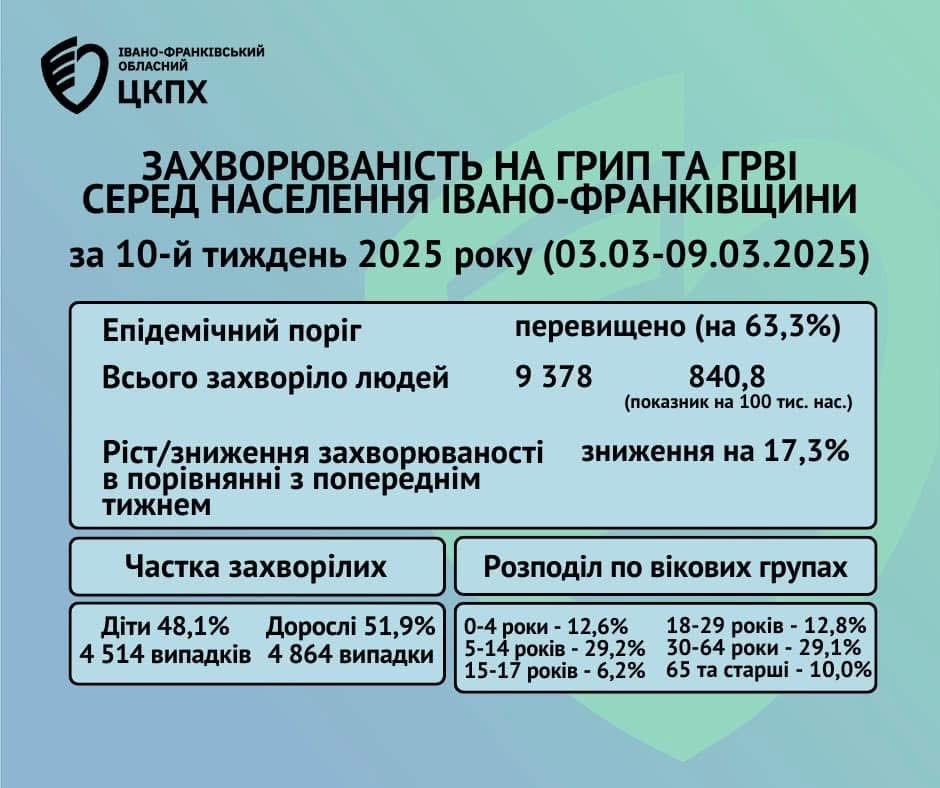 «Впродовж 10 тижня 2025 року в області на грип, ГРВІ та COVID-19 захворіло 9378 осіб, в тому числі 4514 дітей до 18 років, що становить 48,1%. Госпіталізовано протягом 10 тижня всього – 292 особи (3,1% від загальної кількості захворілих), з них 136 дітей до 18 років (46,6%). У тому числі із COVID-19 госпіталізовано 99 осіб, зокрема 20 дітей, що становить 20,2%», – повідомив Руслан Савчук.