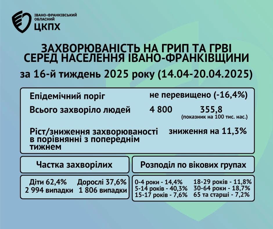 Впродовж 16 тижня 2025 року в області на грип, ГРВІ та COVID-19 захворіло 4800 осіб, в тому числі 2994 дитини 0-17 років, що становить 62,4%.