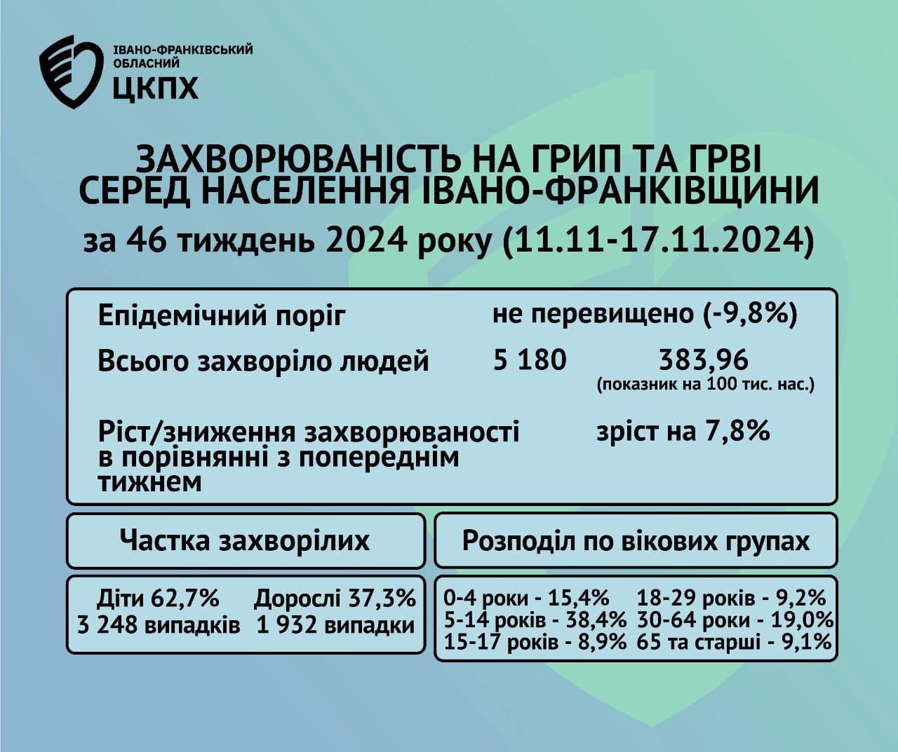 “Впродовж 46 тижня 2024 року в області на грип, ГРВІ та COVID-19 захворіло 5 180 осіб, в тому числі 3 248 дітей до 17 років, що становить 62,7%. Відмічаємо ріст захворюваності на 7,8%”, – зазначив головний державний санітарний лікар Прикарпаття, генеральний директор Івано-Франківського обласного центру контролю та профілактики хвороб МОЗУ Руслан Савчук.