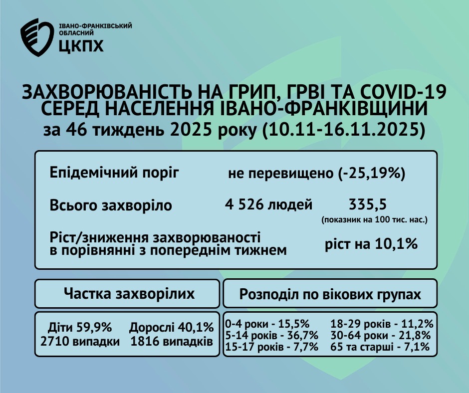 Впродовж 46-го тижня 2025 року на ГРВІ, грип та COVID-19 в області захворіло 4526 осіб.