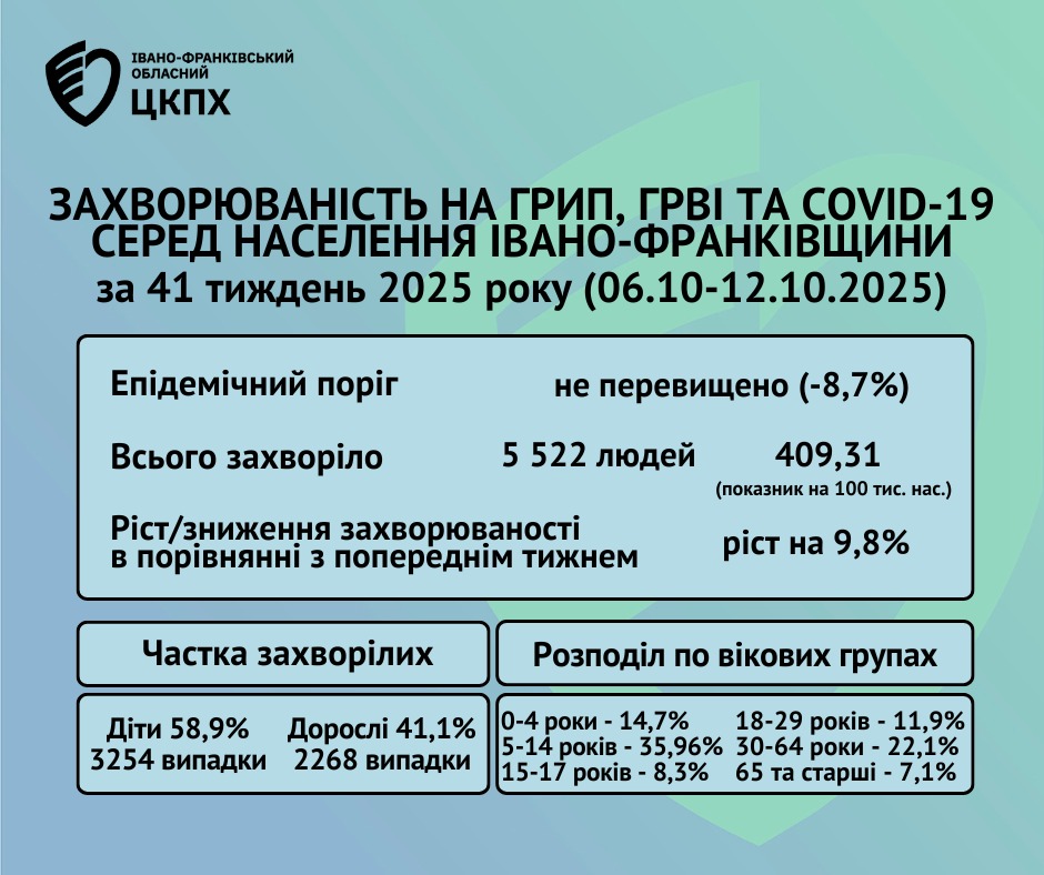 За даними оперативної інформації впродовж 41 тижня 2025 року (початок епідсезону 2025-2026 рр.) на ГРВІ, грип та COVID-19 захворіло 5522 особи, із них 3254 осіб діти 0-17 років (58,9%). У тому числі на COVID-19 захворіло 123 особи, серед яких 21 особа – діти 0-17 років (17,1%).