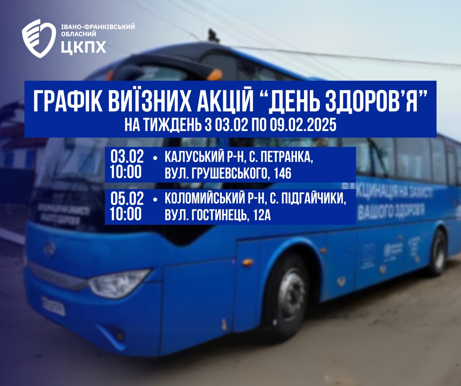 Графік виїзних акцій «День здоров’я» на тиждень з 03.02 по 09.02.2025 року