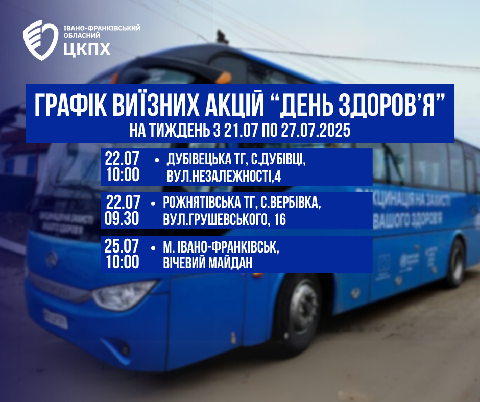 Графік виїзних акцій «День здоров’я» на тиждень з 21.07. по 27.07.2025 року