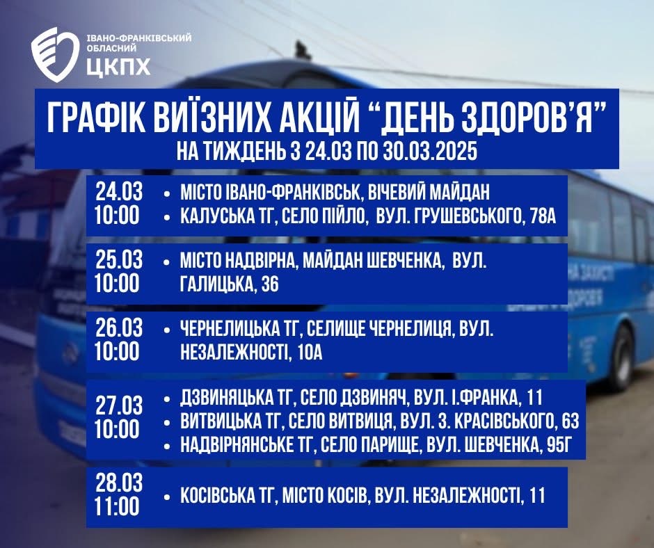 Графік виїзних акцій «День здоров’я» на тиждень з 24.03 по 30.03.2025 року