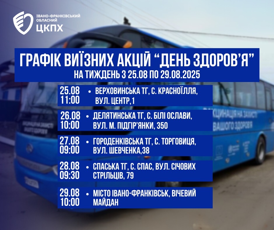 Графік виїзних акцій «День здоров’я» на тиждень з 25.08. по 31.08.2025 року