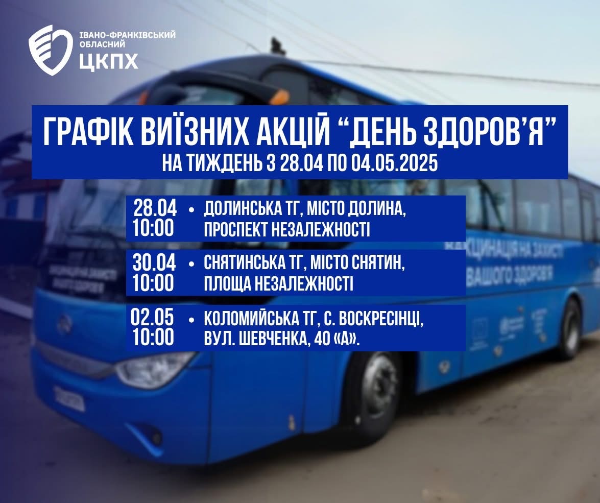Графік виїзних акцій «День здоров’я» на тиждень з 28.04 по 04.05.2025 року