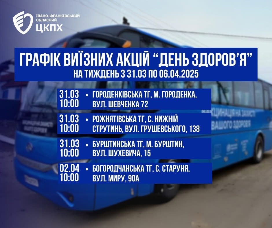 Графік виїзних акцій «День здоров’я» на тиждень з 31.03 по 06.04.2025 року