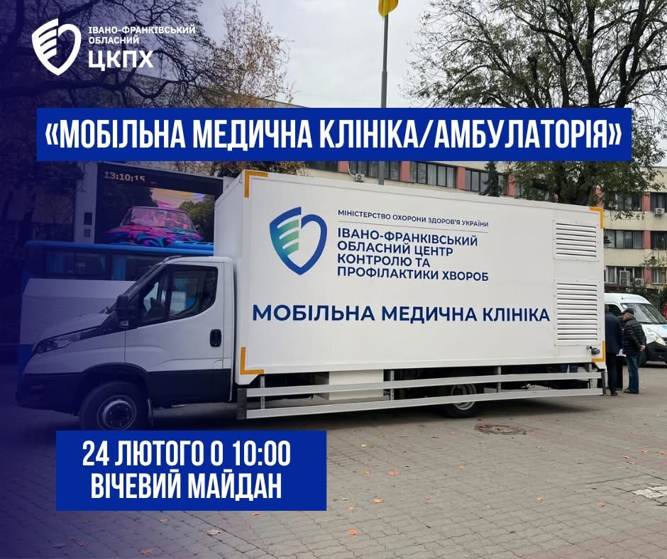 Мобільна амбулаторія надаватиме послуги 24.02 о 10:00 – м. Івано-Франківськ, Вічевий майдан.