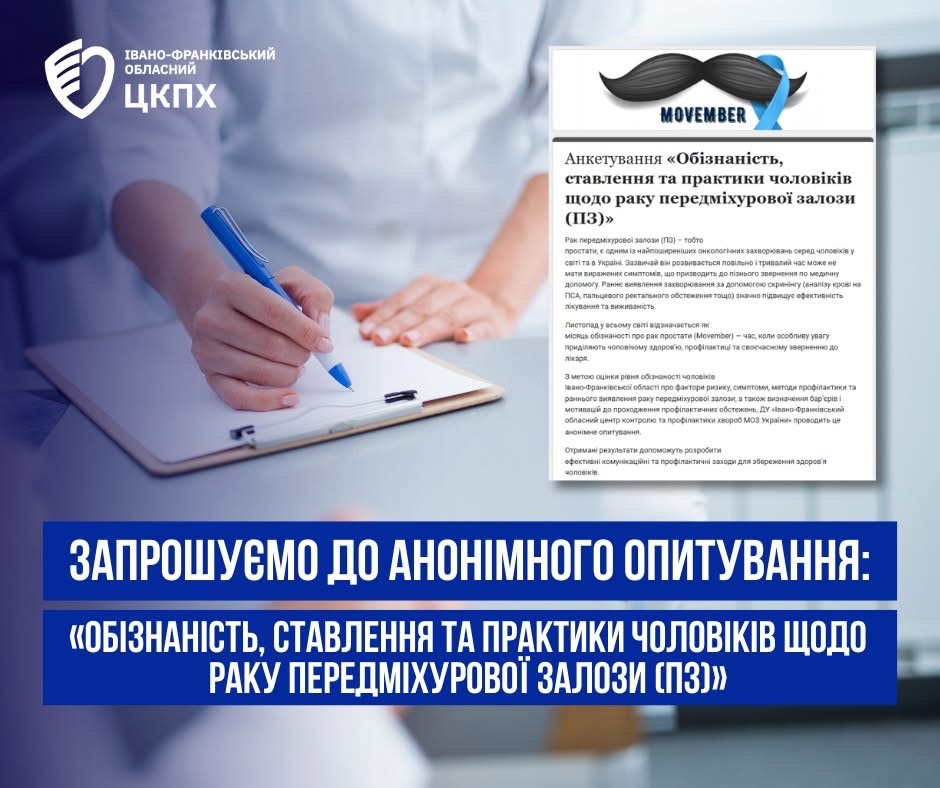 В рамках міжнародного руху Movember, з метою оцінки рівня обізнаності чоловіків Івано-Франківської області про фактори ризику, симптоми, методи профілактики та раннього виявлення раку передміхурової залози, а також визначення бар’єрів і мотивацій до проходження профілактичних обстежень, ДУ «Івано-Франківський обласний центр контролю та профілактики хвороб МОЗ України» проводить регіональне анонімне онлайн-опитування серед чоловіків віком від 40 років і старше.