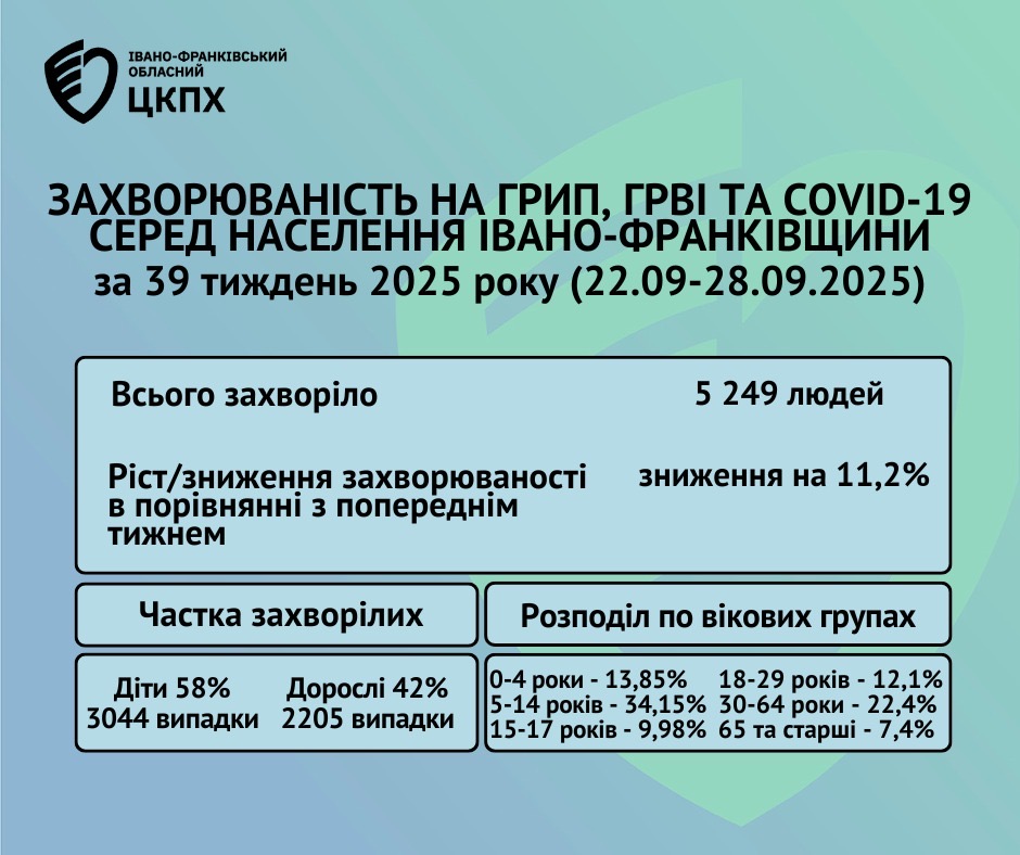 За даними моніторингових спостережень Івано-Франківський обласний центр контролю та профілактики хвороб в період з 21 тижня по 39 тиждень (міжепідемічний сезон) на ГРВІ, грип та COVID-19 захворіло 49819 осіб, із них 26470 осіб діти 0-17 років (53,1%).