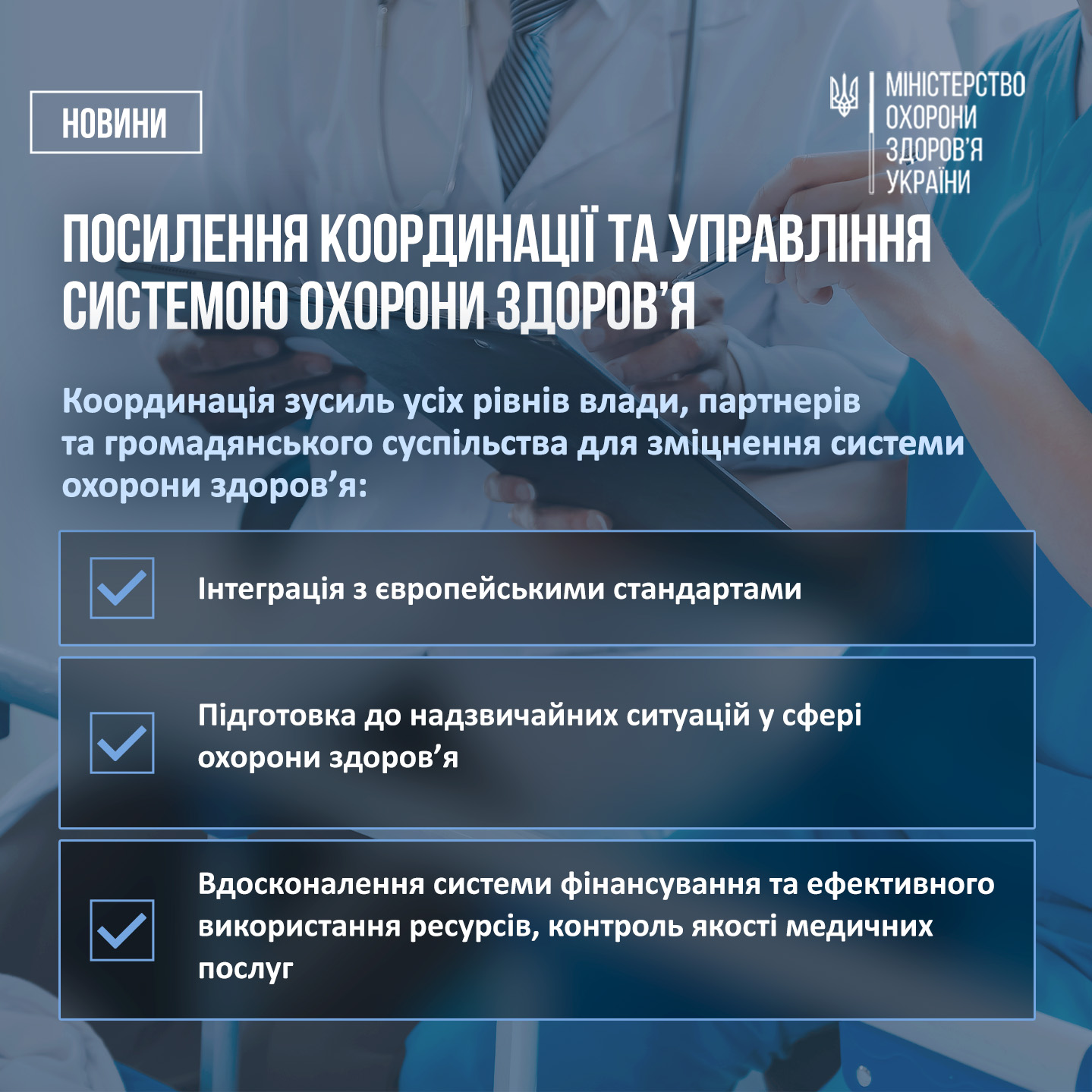 Координація зусиль усіх рівнів влади, партнерів та громадянського суспільства для зміцнення системи охорони здоров’я.