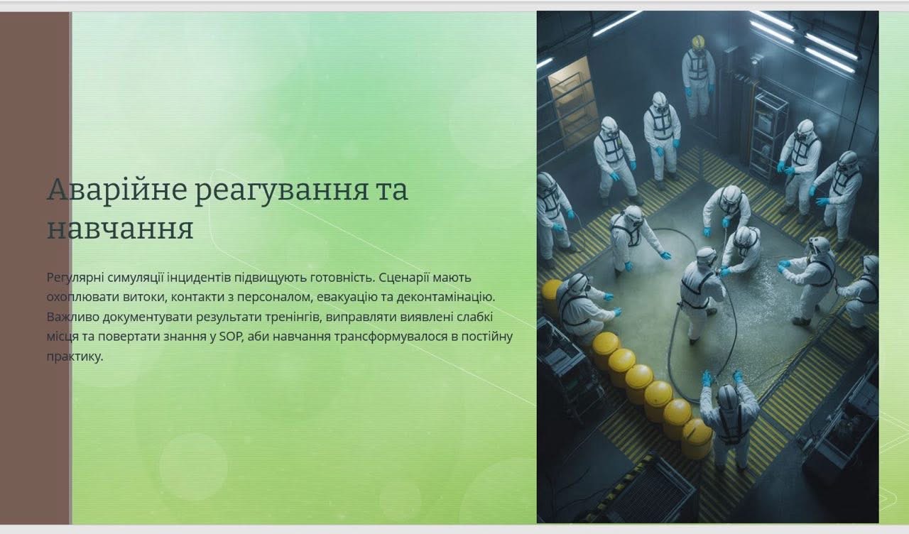 Окремий акцент було зроблено на розборі реальних інцидентів, що дало змогу учасникам краще простежити причинно-наслідкові зв’язки між людським фактором, організаційними недоліками та технічними ризиками. Також було представлено підходи до профілактики лабораторних аварій і практичні інструменти їх попередження.