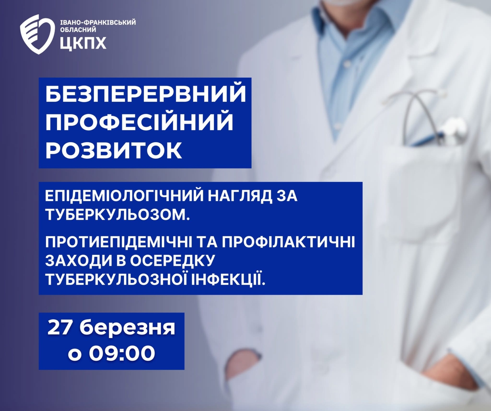 27 березня 2025 року о 09:00 відбудеться онлайн-семінар на тему: «Епідеміологічний нагляд за туберкульозом. Протиепідемічні та профілактичні заходи в осередку туберкульозної інфекції».